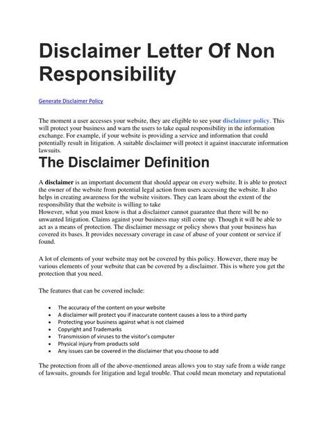 Read SAMPLE DISCLAIMER LETTER OF NON RESPONSIBILITY iBooks Gutenberg